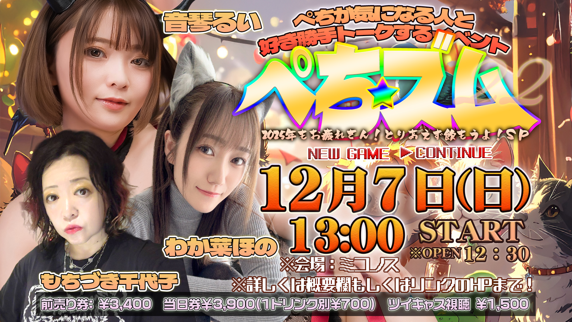 2025/12/7【出演】音琴るい(ぺち) わか菜ほの もちづき千代子 【開催日時】2025年12月7日(日)開場 12:30開演 13:00終了予定 …