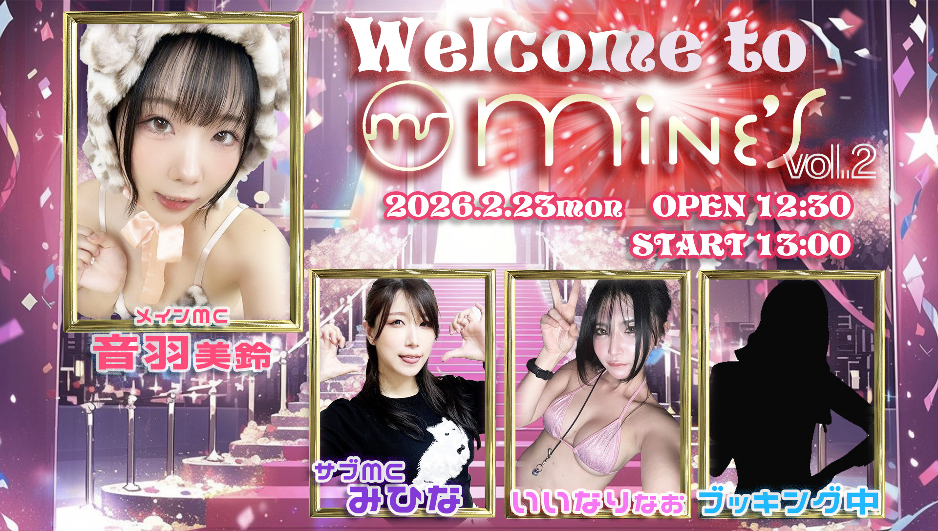 2026/2/23【出演】音羽美鈴(メインMC)みひな(サブMC)いいなりなお 他1名※出演者が変更になる場合がございます。 何卒ご了承ください。※本イベント会場はレフカダ…